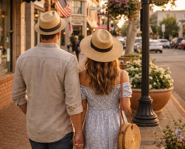 In the evening, the downtown area becomes lively with outdoor dining, patio lights, and wine bars — perfect for a relaxed date night.